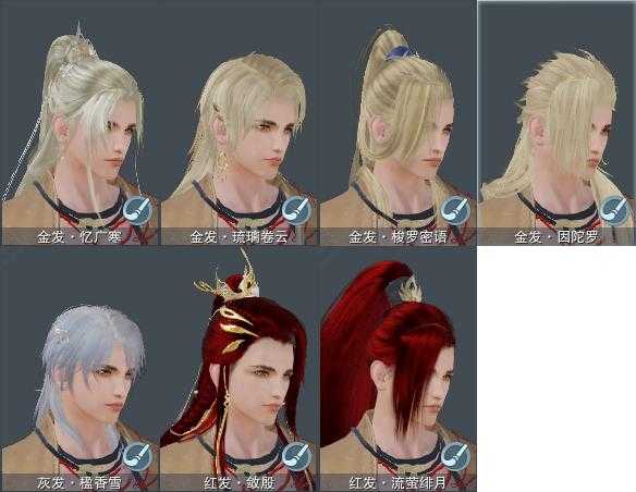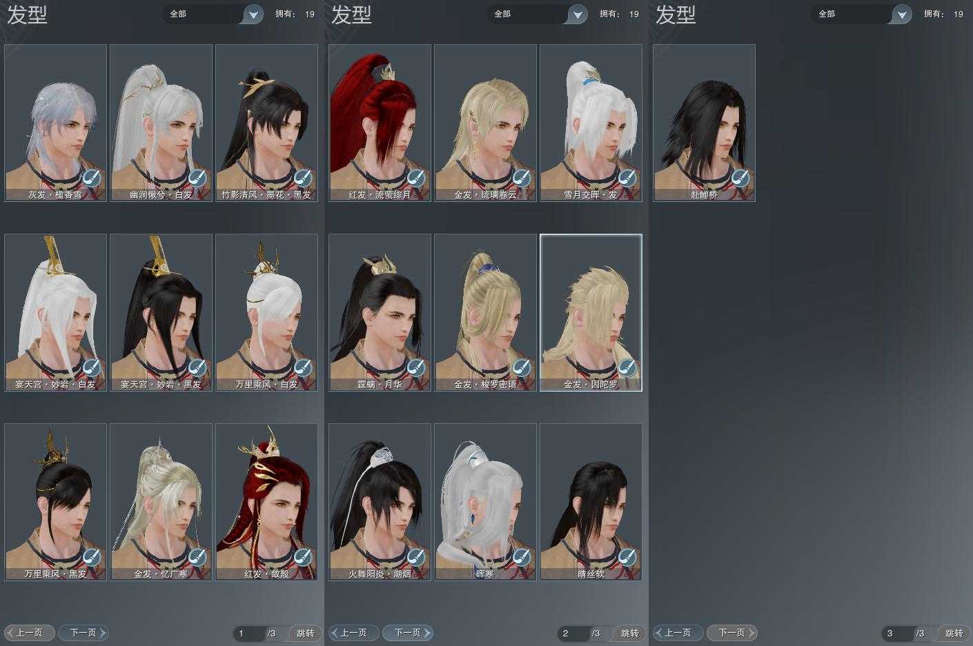 【发型】金发4个[猴金, 兔金, 资历金, 龙女金], 红发3个[猪红, 小资历红, 一代灰], 黑发7个, 白发5个, 盒子发型[乘风黑发, 雪月白发, 乘风白发, 黑狮黑发, 黑狮白发, 竹影墨花黑发, 幽涧愀兮白发], 总页数3