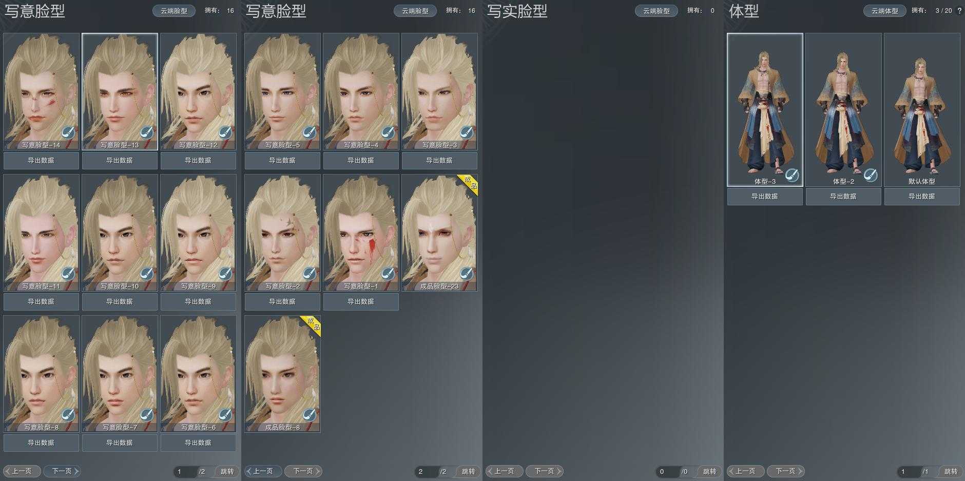 【捏脸】写意脸型16个,写实脸型0个,体型3个