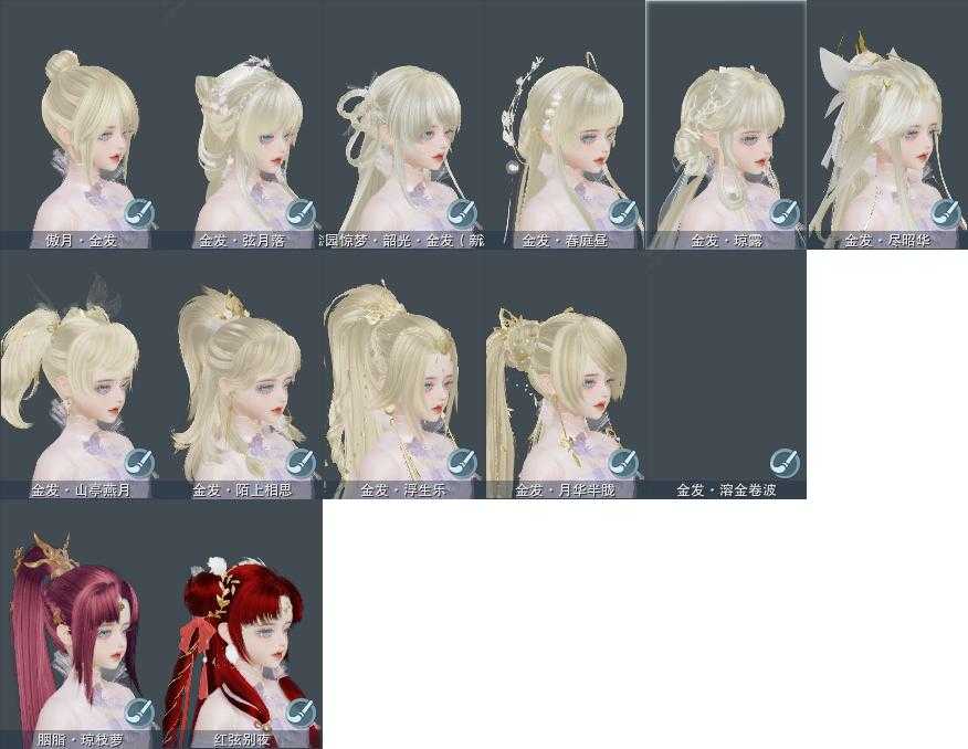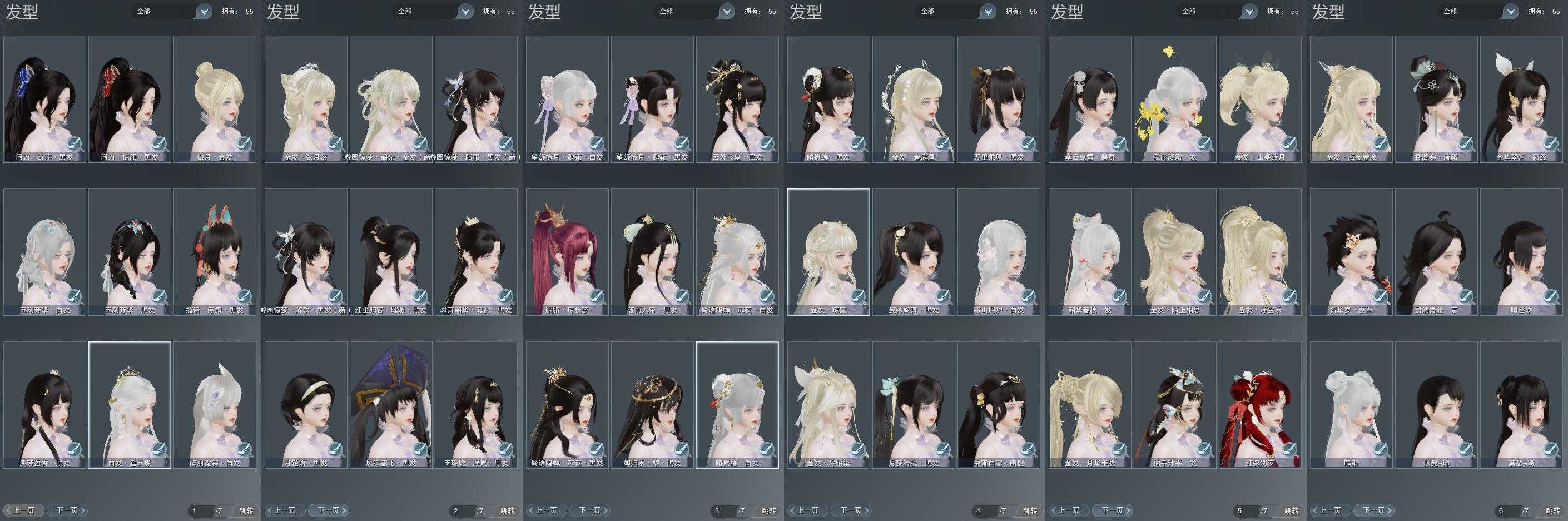 【发型】金发11个[鼠金, 中秋金, 鸡金, 蝶金, 喵金, 考金, 国金, 珊瑚金, 巴卡金, 傲月金发, 新白游园金], 红发2个[紫发, 鸡红], 黑发29个, 白发10个, 盒子发型[元宵黑, 丝路黑, 二代七夕白, 一代重阳白, 乘风黑发, 晴岚绘黑发, 棉袄白, 黑楼兰黑发, 黑如归黑发, 澡盒黑发, 飞皇黑发, 紫中秋黑发, 晴岚绘白发, 黑楼兰白发, 浮岚黑发, 月轻语黑发, 薄雾黑发, 紫中秋白发, 黑红尘黑发, 新紫游园黑, 新蓝游园黑, 六代中秋黑发, 孔雀白发, 红懒猪黑发, 红问刀黑发, 蓝问刀黑发], 总页数6