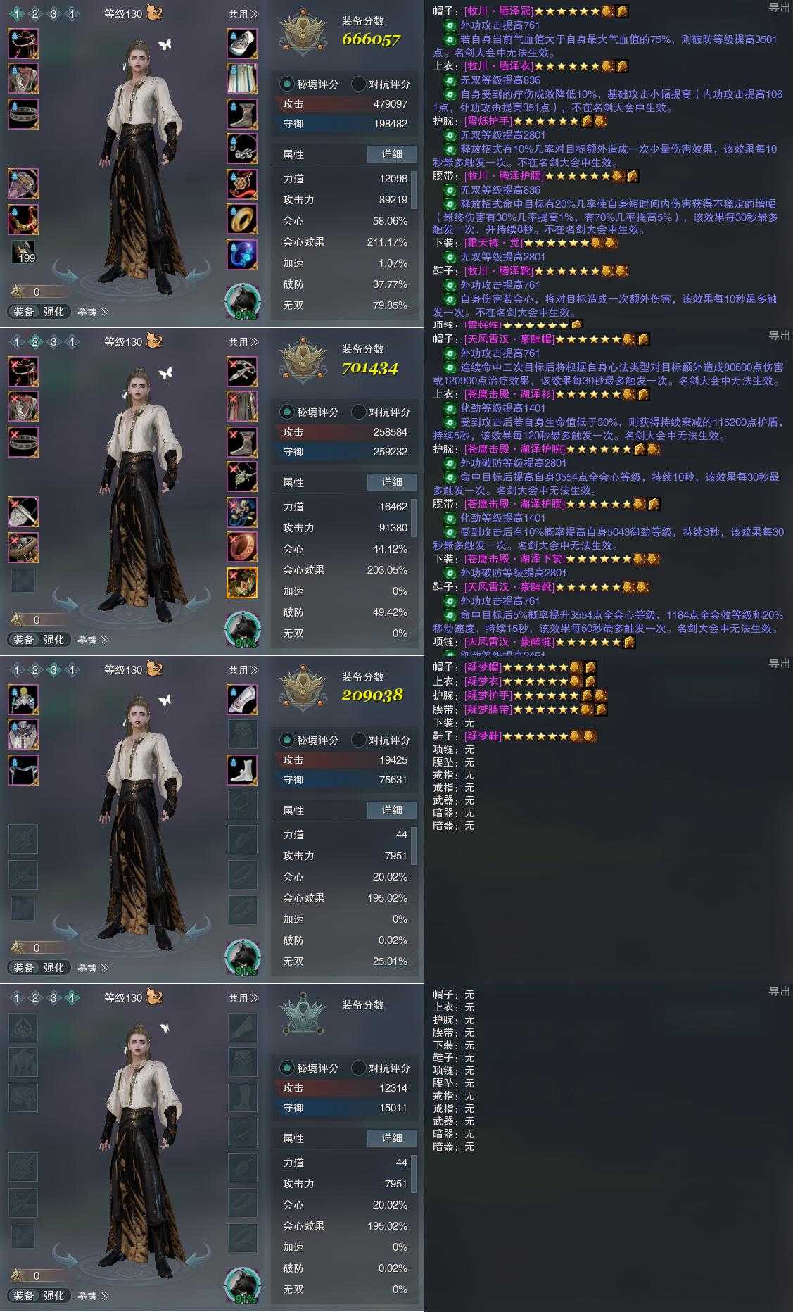【装备】130级,笑尘诀PVE666057,笑尘诀PVP701434,装备三209038,装备四0