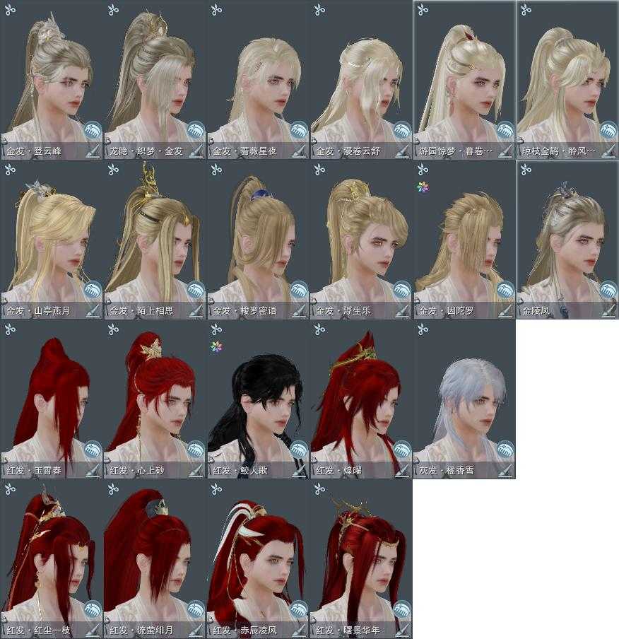 【发型】金发12个[一代金, 猴金, 资历金, 喵金, 考金, 国金, 云金, 蔷薇金, 三代金, 白琼枝金发, 红游园金发, 白龙隐金发], 红发9个[八红, 十二红, 猴红, 兔红, 小资历红, 十五红, 蛇红, 马红, 一代灰], 黑发27个, 白发18个, 盒子发型[白琼枝黑发, 沧海黑发, 唐风玉壶黑发, 黑红尘黑发, 黑狮黑发, 红游园黑发, 沧海白发, 小金龙黑发, 唐风玉壶白发, 黑红尘白发, 黑狮白发, 小熊黑发, 小金龙白发, 十二黑, 六代中秋黑发, 六代中秋白发, 幽涧愀兮白发, 卿酒盒黑发, 蓝钻石盒黑发, 黑椿山黑发, 红黑妖眸盒黑发, 卿酒盒白发, 黑沧洲盒黑发, 西游盒黑发, 圆舞盒白发, 西游盒白发, 熊猫黑发, 黑鹭黑发, 熊猫白发, 十七白发], 总页数8