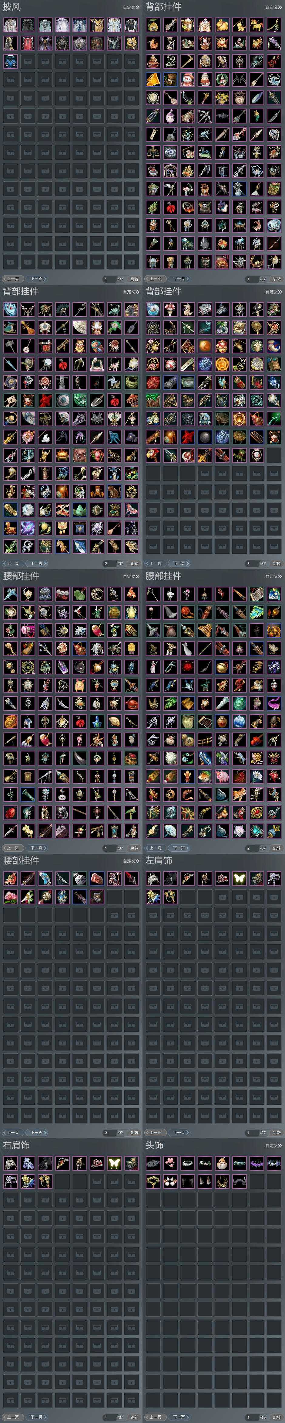 【肩饰】10左,11右,[银枪照夜·裂云·左, 风刀逐浪·左, 伴灵引羽·左, 一念莲华·左, 觅花踪·黄云·左, 九阙天影·左, 霁月雪青·左, 短褐狂裘·左][银枪照夜·裂云·右, 风刀逐浪·右, 伴灵引羽·右, 一念莲华·右, 觅花踪·黄云·右, 九阙天影·右, 霁月雪青·右, 短褐狂裘·右]