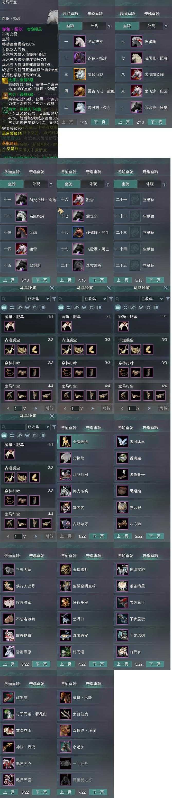 【坐骑】20个[踏炎霸地, 西风瘦逐狱, 浩气狮, 飞霞骠黑云, 里飞沙归云, 乌蹄抱月, 赤兔扬沙, 白龙马, 浪风燕今古, 霸红尘, 雷首飞电逾虹]