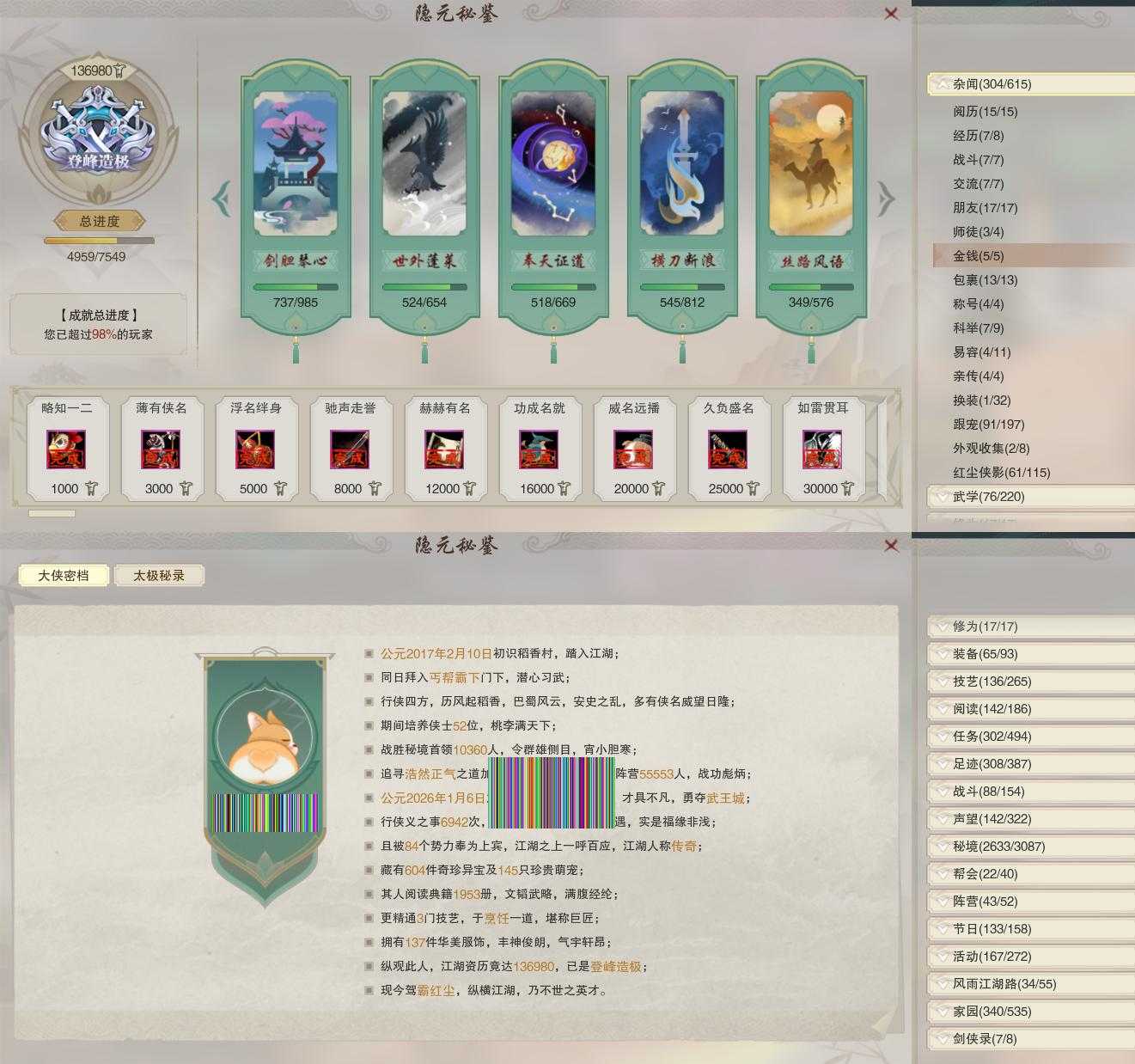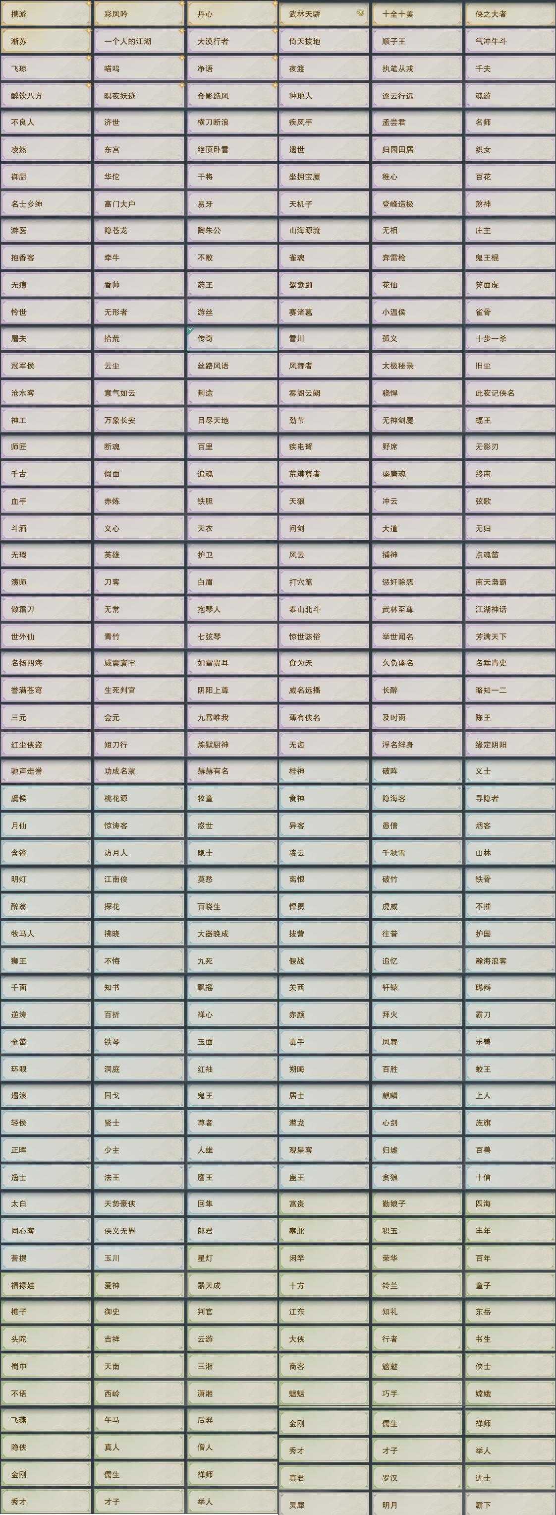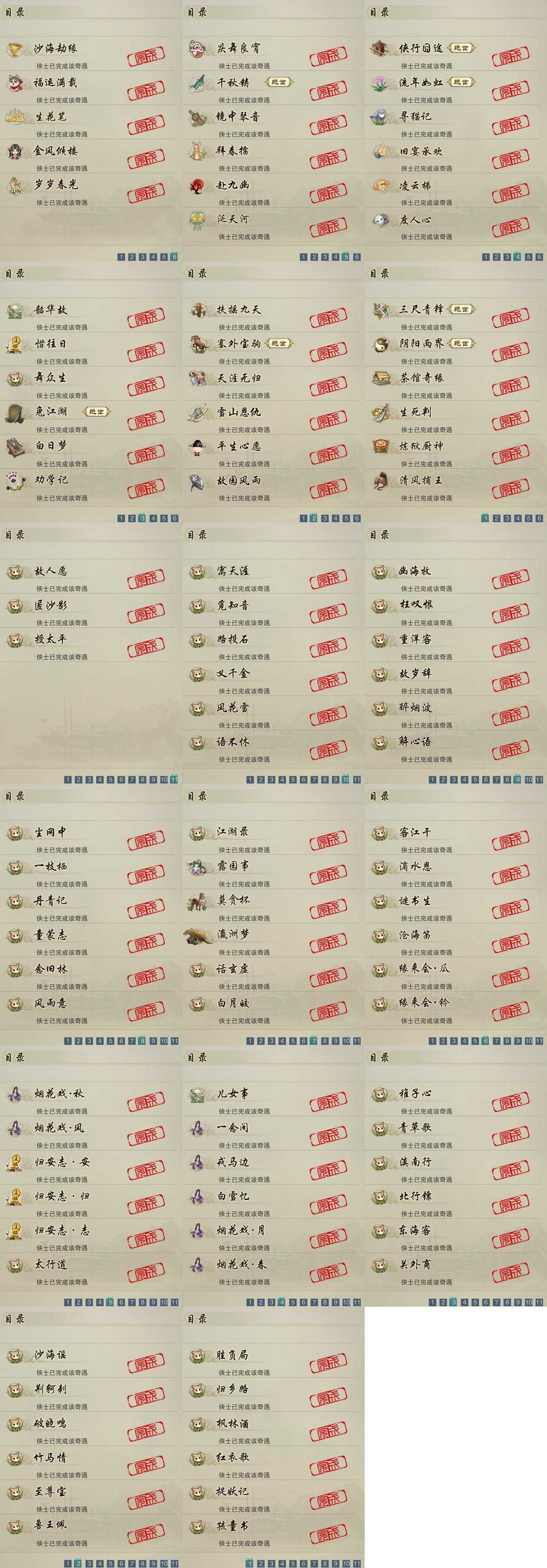 【奇遇】34个[白日梦, 天涯无归, 劝学记, 雪山恩仇, 阴阳两界, 兔江湖, 平生心愿, 惜往日, 塞外宝驹, 韶华故, 扶摇九天, 故园风雨, 三尺青锋, 流年如虹, 舞众生, 清风捕王, 侠行囧途, 寻猫记, 茶馆奇缘, 庆舞良宵, 生死判, 千秋铸, 凌云梯, 炼狱厨神, 赴九幽, 度人心, 旧宴承欢, 镜中琴音, 泛天河, 沙海劫缘]