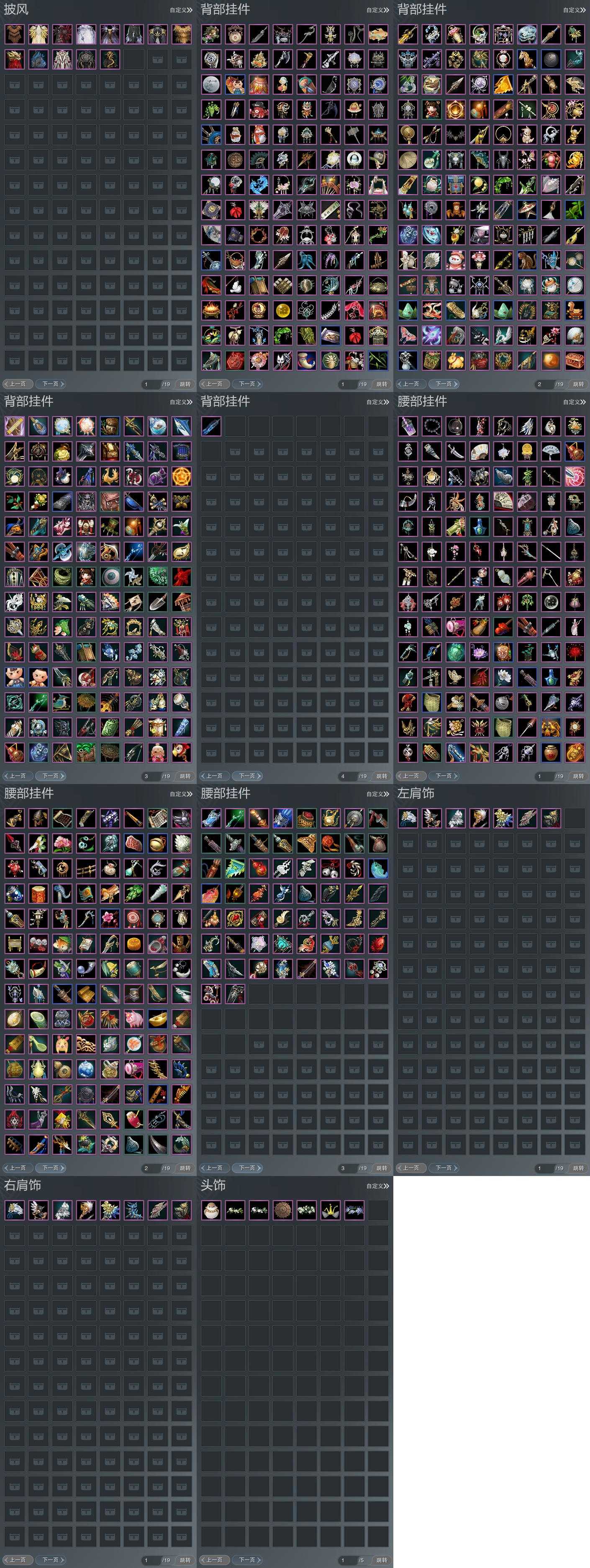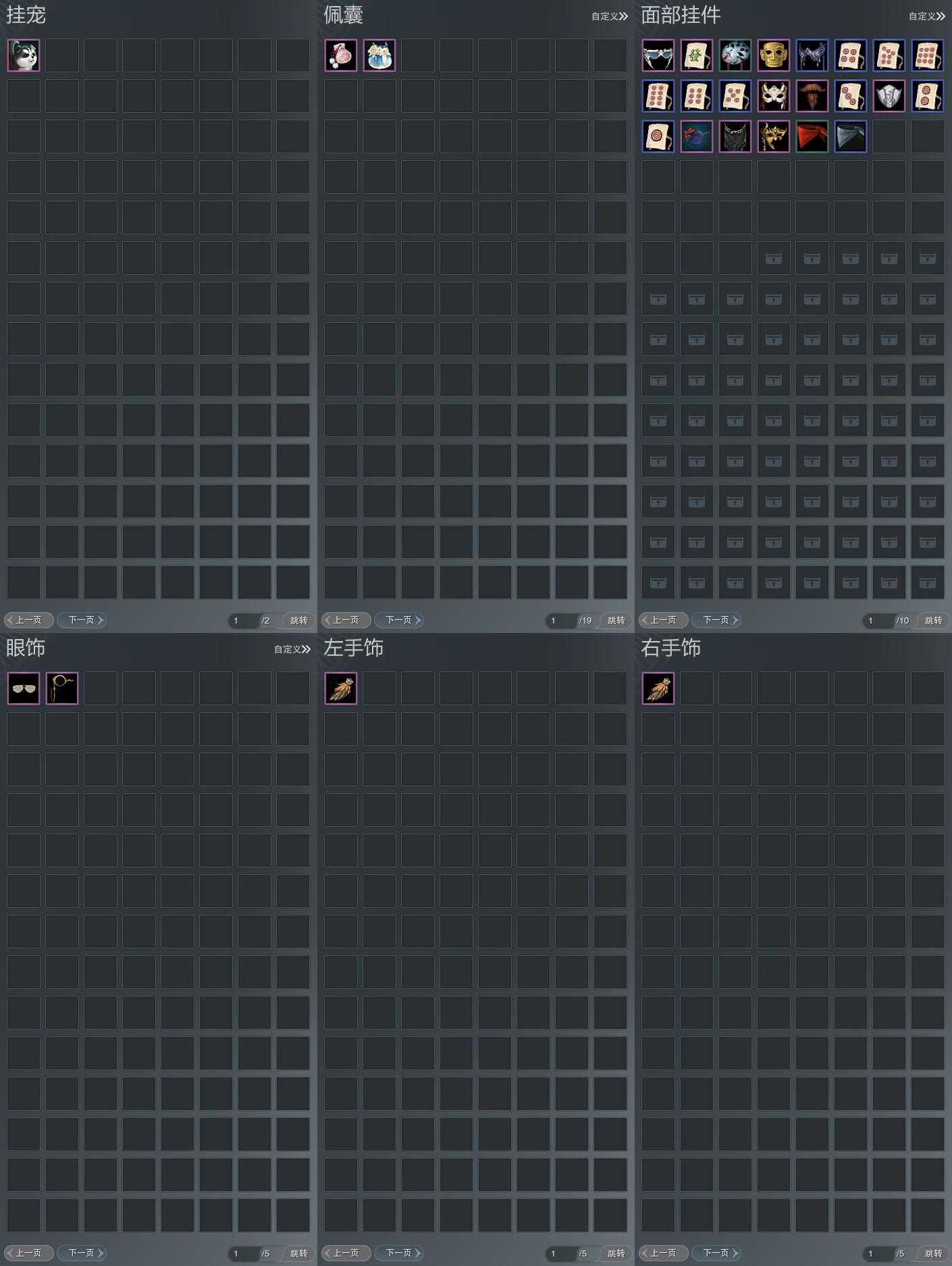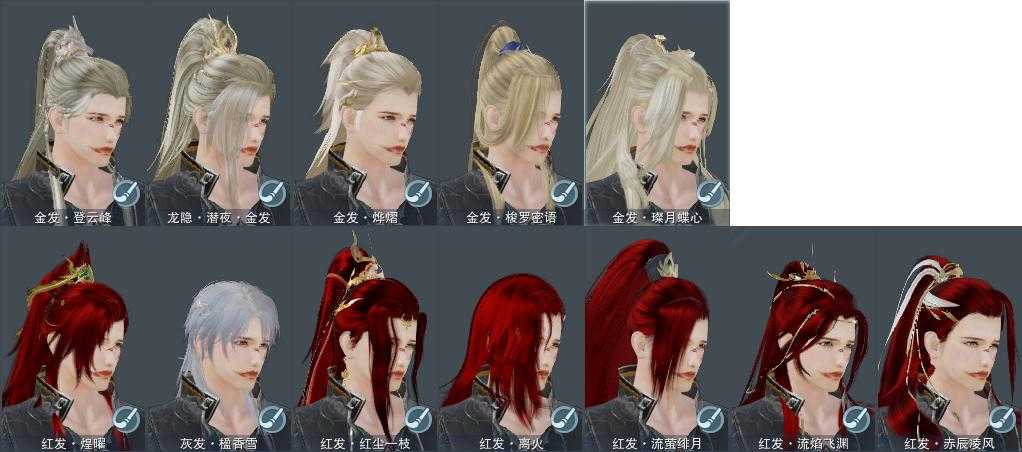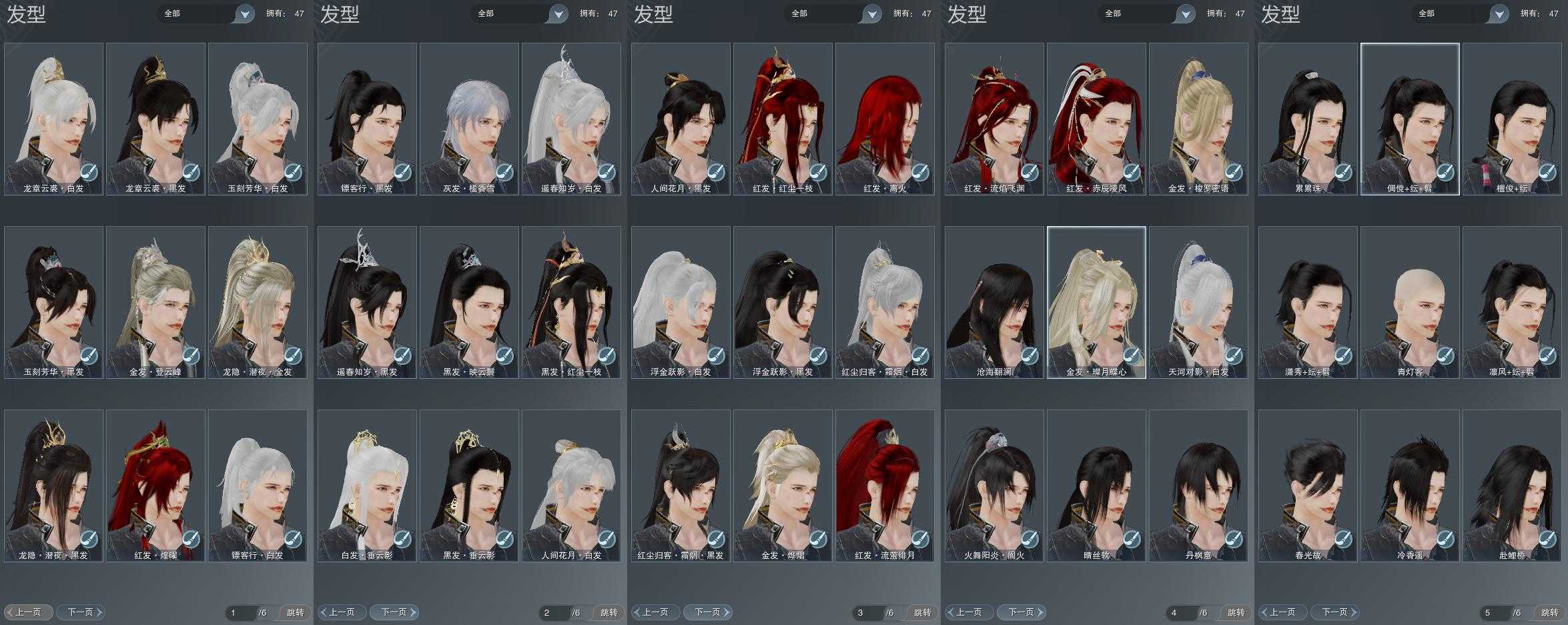 【发型】金发5个[狐金, 资历金, 猪金, 三代金, 黑龙隐金发], 红发7个[八红, 九红, 十二红, 兔红, 小资历红, 大资历红, 一代灰], 黑发16个, 白发9个, 盒子发型[白红尘黑发, 小金龙黑发, 白红尘白发, 小金龙白发, 十二黑, 芙蓉黑发, 芙蓉白发, 红梅盒黑发, 红梅盒白发, 镖盒黑发, 镖盒白发, 黑龙隐黑发, 墨龙盒黑发, 墨龙盒白发], 总页数5