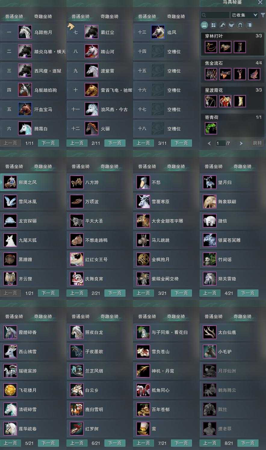 【坐骑】13个[踏炎横天, 西风瘦逐狱, 乌蹄抱月, 浪风燕今古, 霸红尘, 雷首飞电驰辉, 乌鬃踏焰驹]