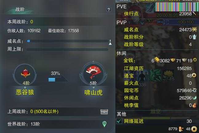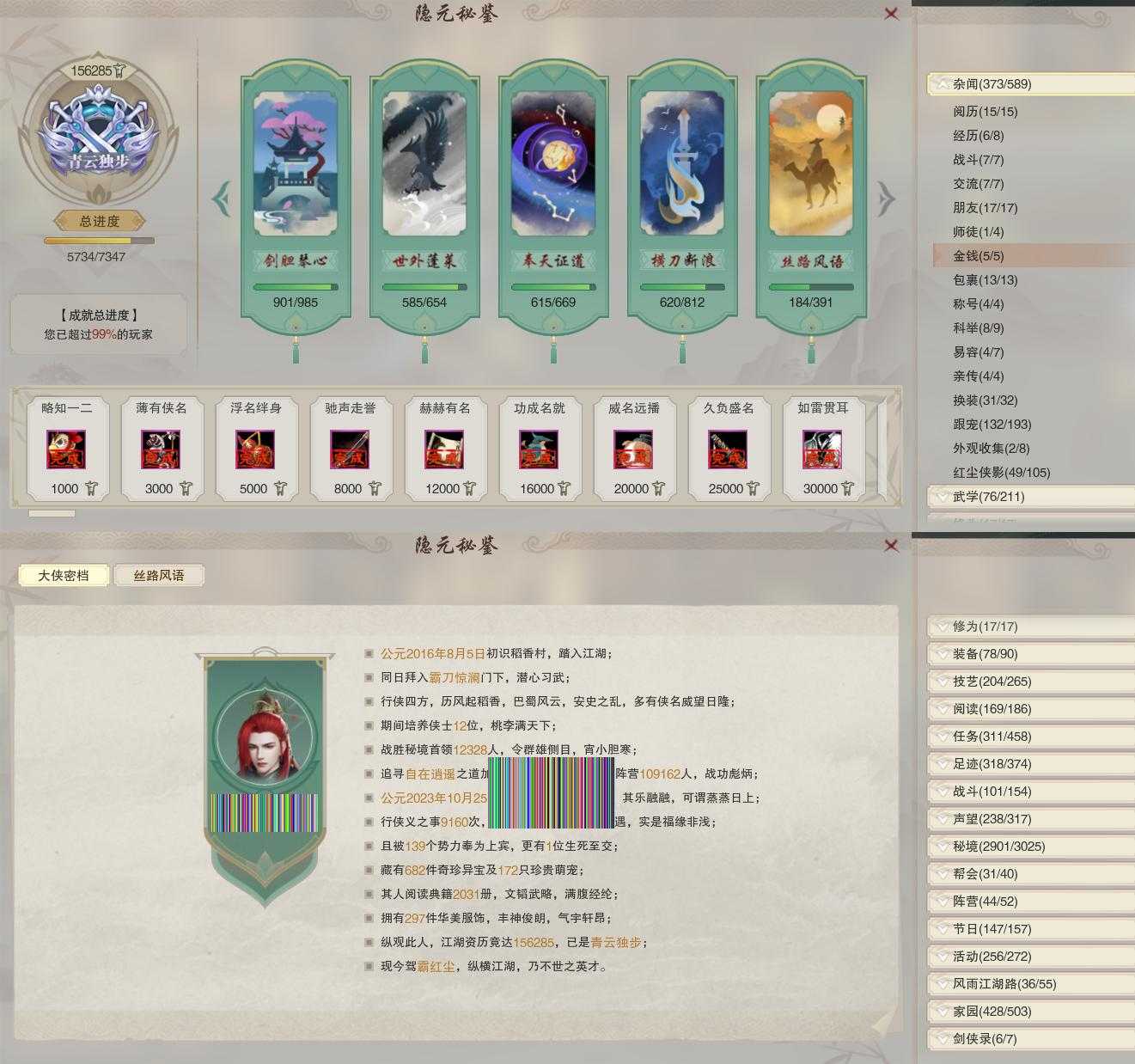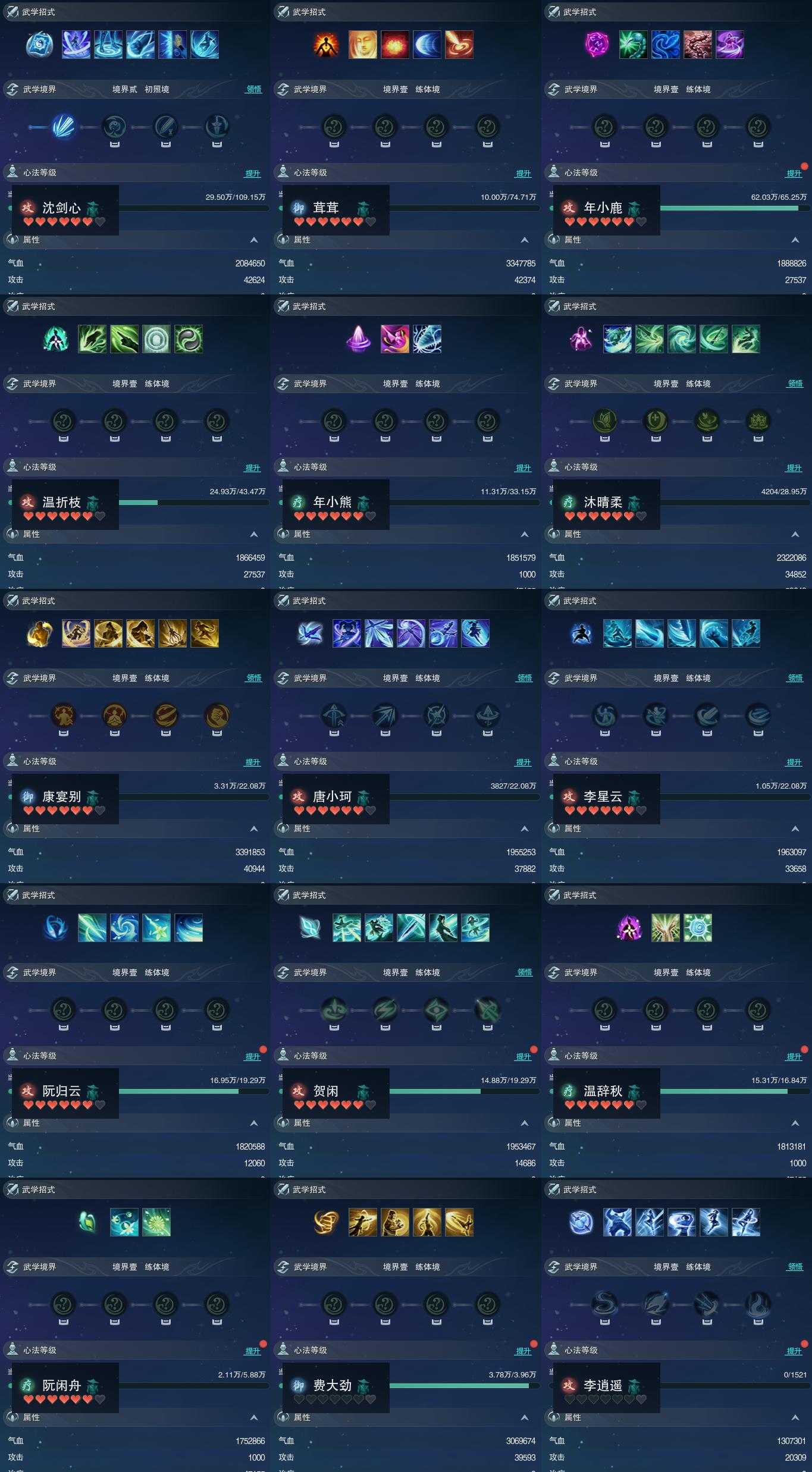 【同伴】沈剑心86级境界贰,茸茸82级境界壹,年小鹿81级境界壹,温折枝78级境界壹,年小熊76级境界壹,沐晴柔75级境界壹,康宴别73级境界壹,唐小珂73级境界壹,李星云73级境界壹,阮归云72级境界壹,贺闲72级境界壹,温辞秋71级境界壹,阮闲舟63级境界壹,费大劲60级境界壹,李逍遥1级境界壹