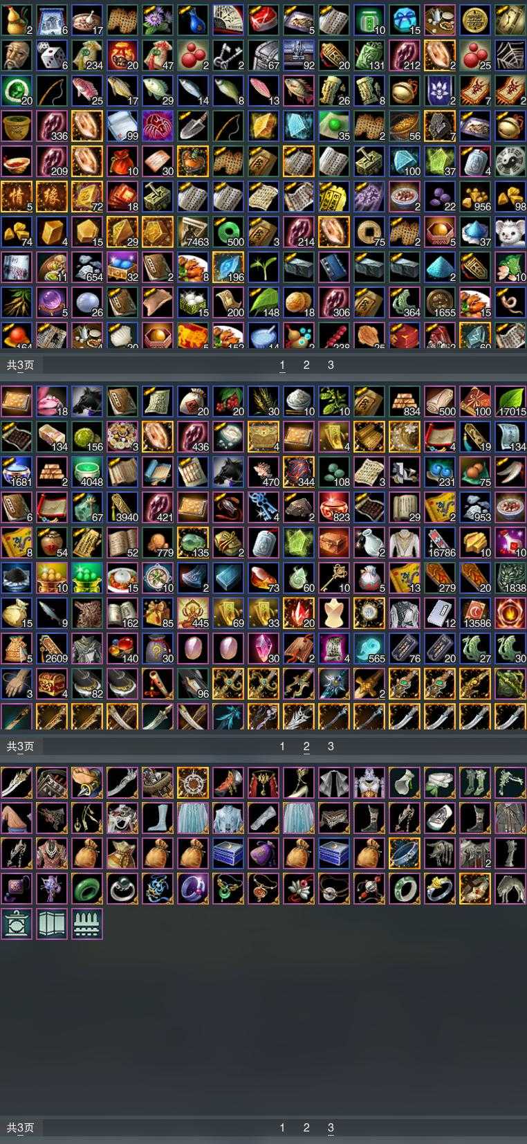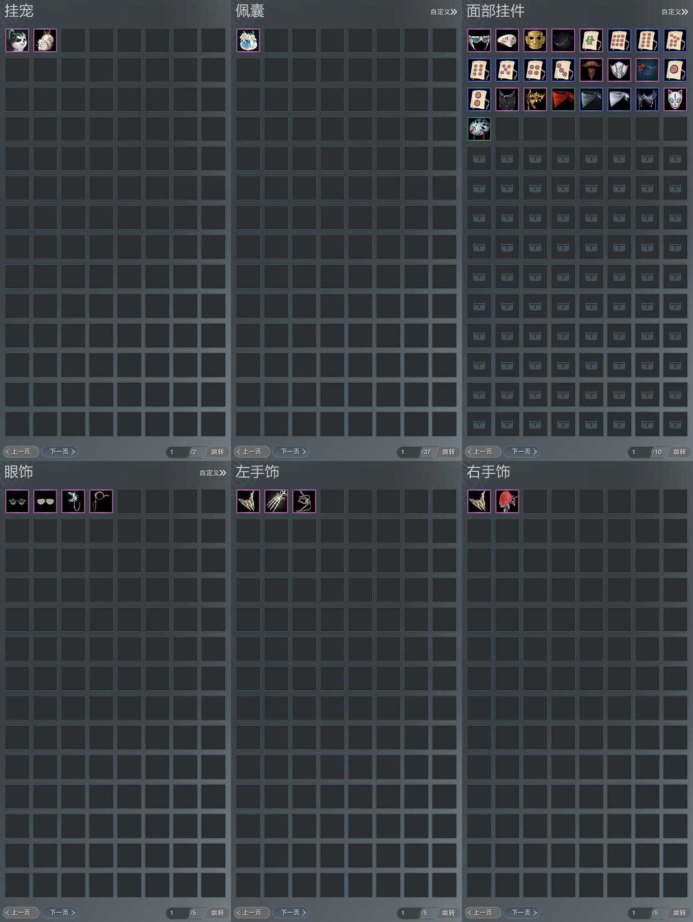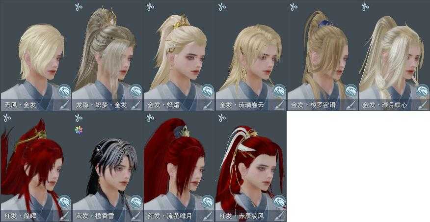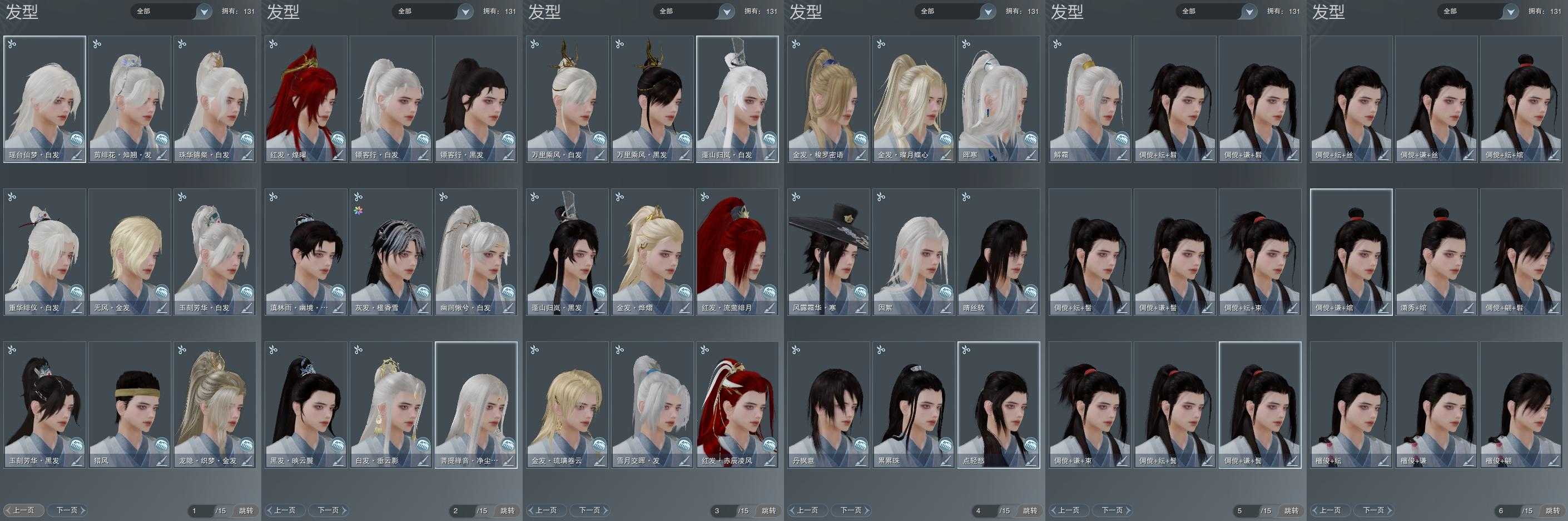 【发型】金发6个[狐金, 资历金, 龙女金, 猪金, 无风金发, 白龙隐金发], 红发4个[八红, 兔红, 小资历红, 一代灰], 黑发12个, 白发15个, 盒子发型[二代花朝黑, 乘风黑发, 雪月白发, 二代花朝白, 乘风白发, 净尘白发, 幽涧愀兮白发, 镖盒黑发, 黑傣族黑发, 镖盒白发, 瑶台仙梦白发], 总页数6