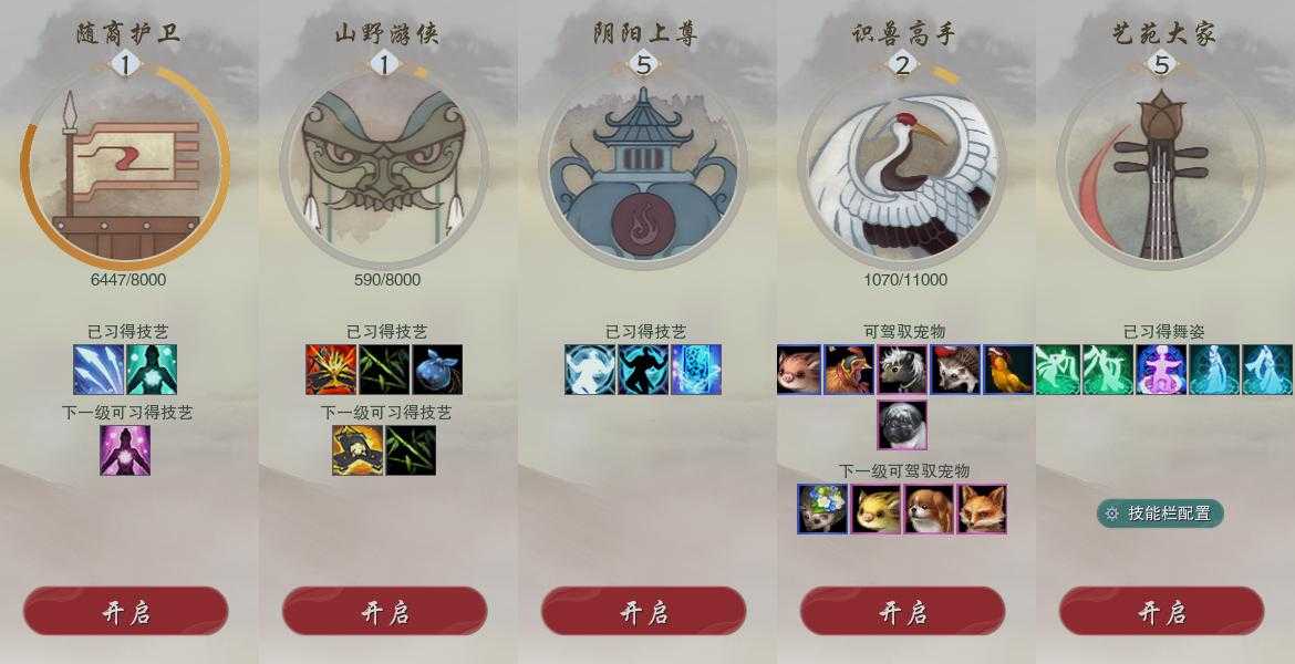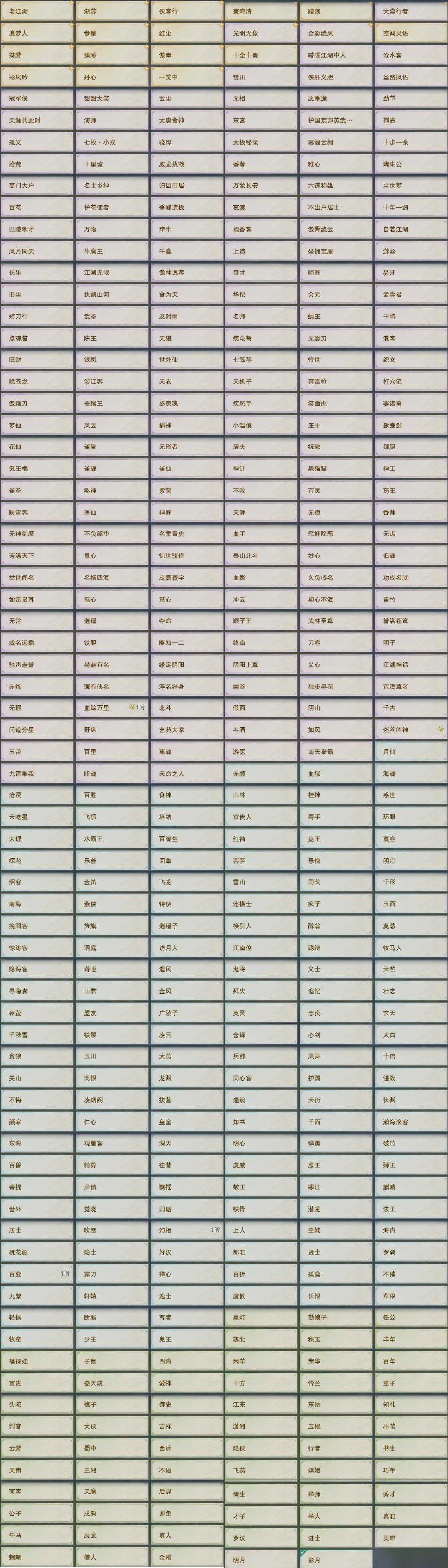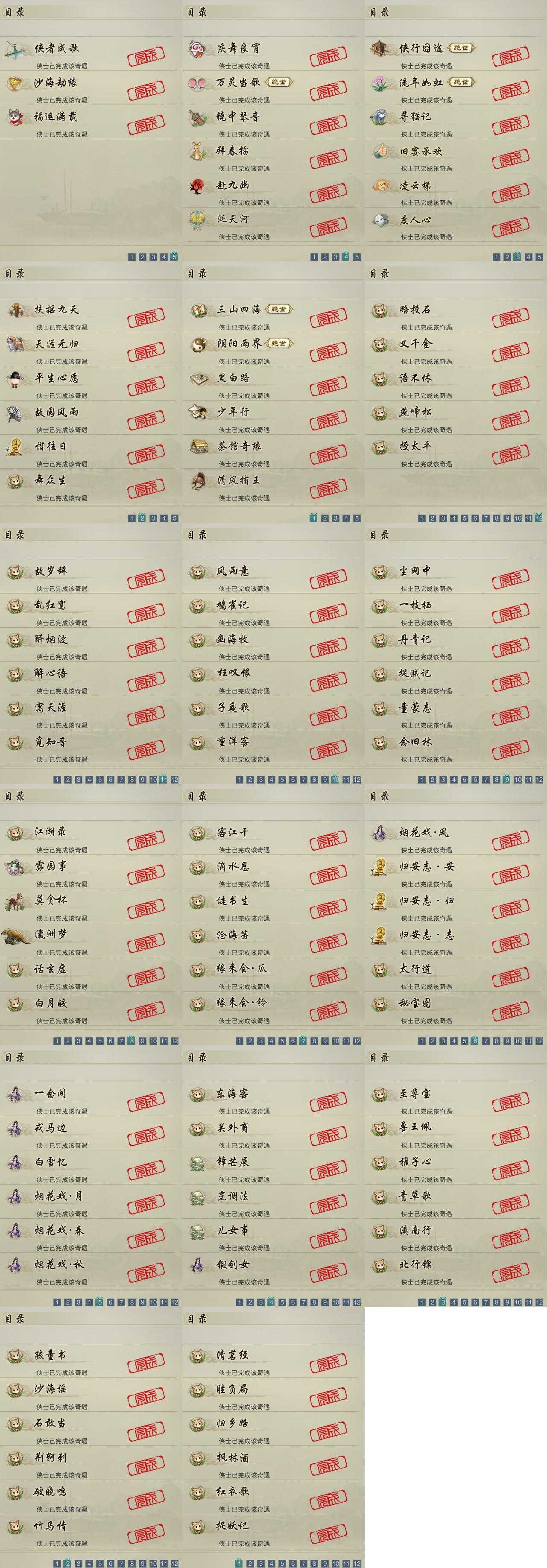 【奇遇】27个[天涯无归, 三山四海, 阴阳两界, 平生心愿, 黑白路, 惜往日, 少年行, 扶摇九天, 故园风雨, 流年如虹, 舞众生, 清风捕王, 侠行囧途, 寻猫记, 茶馆奇缘, 庆舞良宵, 万灵当歌, 凌云梯, 赴九幽, 度人心, 旧宴承欢, 镜中琴音, 泛天河, 侠者成歌, 沙海劫缘, 拜春擂, 福运满载]